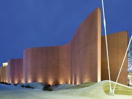 As the ramp weaves a path, small custom designed buried fixtures fitted with a 2,700K LED and diffusion film up light the walls at the pinch points, effectively creating an interesting perspective vista at night through the canyon-like space. At the top of the ramp a large drum houses a state-of-the-art auditorium and interactive post show space.