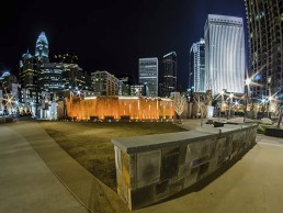 Pronounced shadows are revealed throughout the gardens by well-positioned precision accent light clusters mounted to poles. Lighting has helped create an authentic urban experience that celebrates Charlotte’s history and culture. Both orientation and wayfinding are reinforced by insightful arrangements of lighting equipment, with respect to the various activity nodes.