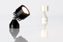 The LED Luc adjustable LED IP44-rated spotlight uses magnets twice in the design firstly to fix the luminaire base in place on a steel surface, and secondly as the force that holds the adjustable ball joint onto the base. The miniature magnets used are powerful and ensure that the projector head does not droop in use while allowing easy aiming, adjustment and repositioning. A soft flexible cable runs from the body to a remote driver with a jack plug connection.