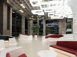 The waffle slab system, one of the earliest design decisions and most dominant part, is left exposed to highlight the structural clarity of the space. The pattern of the waffle system acted as a springboard for the design of the customised lighting, which resulted in a highly dynamic space reflecting the geometry of the structural system. As previously mentioned the central column anchors the spatial disposition in the vast lobby. The architectural lighting has been conceived as foliage which stems from this anchoring element. The column has been clad with corian panels, with special details to provide access for maintenance and service.