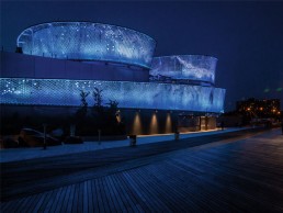 As the sun sets, the automatically triggered display shifts from less saturated tints of cyan and emerald and transitions the building into richer tones of blue and purple as night falls. The colours and rhythms of the natural wind are reminiscent of the natural bioluminescent tides and backlight flickers through, creating a silvery shimmer of fish-like scales across the wall.