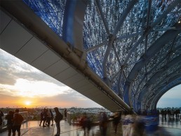 More than 1,000 fixtures are integrated into the perforated metal shell of the roof canopy, creating a sense of mystery and intrigue within the luminous façade as it rises up, revealing the stadium within. These colour-changing fixtures light the space frame structure that supports the canopy and from the exterior, visitors see the lighting on the internal structural elements through perforations in the façade. The density in these perforations changes around the canopy shell, which creates a variation in the effect as you move around the site.