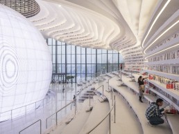 “The Tianjin Binhai Library interior is almost cave-like, a continuous bookshelf,” says Winy Maas, co-founder of MVRDV. “Not being able to touch the building’s volume we ‘rolled’ the ball shaped auditorium demanded by the brief into the building and the building simply made space for it, as a ‘hug’ between media and knowledge.”