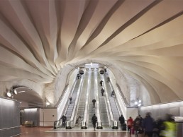 Alongside the many artworks on display, the station features a unique, swirling ceiling detail in the approach to the main escalators. The detail creates a sense of movement from above, accentuating the feeling of transportation as passengers enter and exit the station.