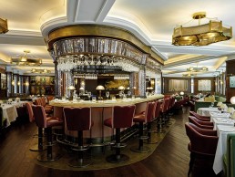 Within a series of ceiling coffers, MBLD installed a new LED linear lighting system by Lumino, ColorCORE, which offers a 2,000K colour temperature and allows a more truly warm rendered atmosphere using the TM-30-15 colour rendition method. These are supplemented by a series of custom-made pendants by ANDDesign, which use the Segula Vintage LED lamp – mimicking the warmth of the old GLS lamp. The same light source is used for the bronze and glass wall lights around the space. At the centre of the space is a new oval bar with a mirrored backdrop, which features integral Lightgraphix downlights shining down through the glasses. Additional lighting is provided by a series of decorative fittings mounted on the bar top, which have dimmable halogen capsule lamps.