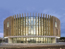 Due to its circular shape, the whole building appears to emanate from a central point, the large, three-storey atrium. The whole building seems to channel visitors into this fabulous space, and the lighting revolves around this concept. The linear lighting emphasises this, while providing an optical illusion that the entire building is sloping inwards.