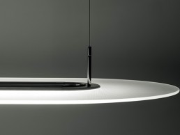Fuga is a pendant lighting fixture that creates an independent, autonomous form. With its slim profile dimensions and flexible product layout, a fascinating tension between the closed, ceiling mounted and pendant illuminated profiles is created. At the same time, a relational space develops between the object and architecture. The lower horizontal bar includes an LED-strip with diffuser for a homogenous light output. This bar can be repositioned to an offset position or in the middle of the vertical bar. The additional possibility to rotate the lower horizontal bar makes Fuga a dynamic pendant luminaire.