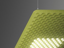Sound-absorbing suspension light, Eggboard consists of two active faces that have been carefully designed by Giovanni Giacobone and Massimo Roj, for maximum acoustic and luminous efficiency. When positioned approximately one metre above head height, the sinusoidal or “egg-carton-like” surface of the lower board absorbs sound whilst the direct emission board - containing low-voltage LEDs adjusted with roto-symmetrical reflectors - ensures maximum lighting comfort.