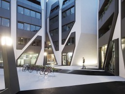 Challenged by J.MAYER.H's angular design, lichttransfer has created a bespoke lighting scheme that celebrates the contemporary architecture, while creating an inviting communal space for workers, residents and visitors of Sonnenhof's courtyard.