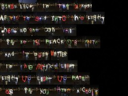 Each image was photographed and projected onto a building façade so that the participants could see their contribution magnified. Each word was combined together after the festival to create a huge image and a film containing all the photos and therefore all of the participants.