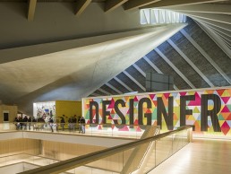 Conservation requirements on paper and textiles were adhered to whilst the use of ambient light in the circulation zones countered the effects of lower light levels. A lensed linear luminaire by L&L Luce & Light, was used on the moving info graphic title wall, which invites the public into the exhibition as you enter the museum at ground level. It injects the huge minimalist atrium with an energy and a hint at the creative innovation and invention on display.