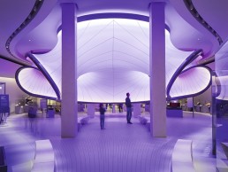 Inside the museum, visitors find themselves in a central atrium with striking views up to the iconic hyperbolic paraboloid roof. The stunning concrete roof spans the length of the building, rising on the two opposing corners to create a manta ray-like structure above. Galleries, learning spaces, a café, an events space and a shop are arranged like an opencast mine around the main atrium, allowing visitors to navigate with ease.