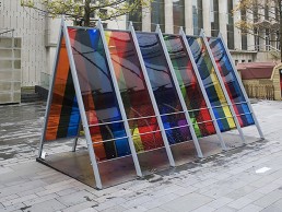 Liz West is working in partnership with Castlefield Gallery and Allied London on a brand new public art commission for Spinningfields, Manchester. Through No. 3 is a six-metre long triangular prism corridor of light and colour installed on Crown Square in Spinningfields from the 25 November 2015 to 6 January 2016. The artwork will be unveiled at 5:30pm on 25 November 2015, when it officially opens for the public to enter the artwork and see its surroundings through a spectrum of colours.