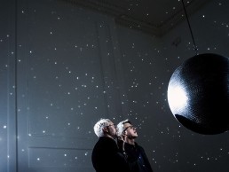 Whilst artists have always been intrigued and inspired by light, more conceptual approaches in the last twenty years have adapted the energy of light into other forms to articulate singular impressions of time and space. Cerith Wyn Evans’s Diary: How to improve the world (you will only make matters worse) continued 1968 (revised) from ‘M’ writings 67-72 by John Cage (2003), uses a crystal chandelier to convey a Morse code translation of Cage’s writings; Ceal Floyer’s Light (1994), presents a solitary unconnected bulb lit up from four sides by slide projectors; Totality (2015) stages Katie Paterson’s immersive installation featuring a large rotating planet-like mirror ball that illuminates a room with tiny projected images of nearly every solar eclipse documented by humankind; and Mark Garry’s large-scale thread installation reveals rainbow-hued graphic abstractions, visible only when the visitor moves around the gallery.