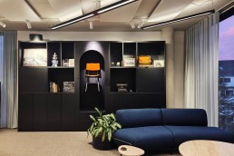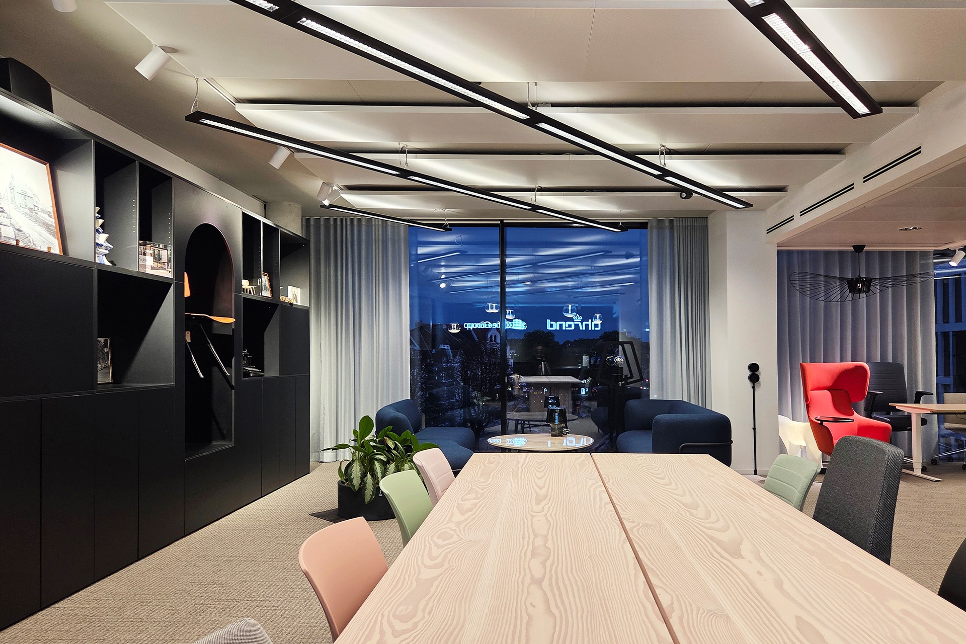 The lighting concept therefore differentiates the space through use and mood. Quiet office areas are lit with restraint, with white luminaires. The existing fixtures that came with the building were originally grey, got refurbished and adapted to their new role. In contrast, the event and showroom areas are defined by bold, black, diagonally arranged luminaires with strong graphic presence.