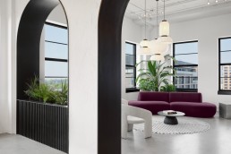 At the heart of the project is the welcoming lounge. Furniture takes on curved forms and a splash of plum colour is woven into the space, which adds a touch of “vivacity and contrasts with the vegetation already present”. &Tradition’s Formakami pendants, by Jaime Hayon, cluster above the seating area, reinforcing the curvature forms of the furniture. The pendants are a contemporary expression of the traditional Asian lanterns, hand crafted with ivory white rice paper and black stained oak accents.