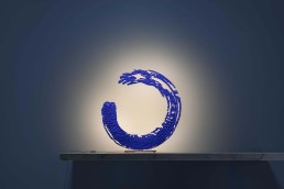 The Ensō lamp features a hand-painted blue structure that mimics the fading ink of an unfinished circle, resting on a brass base. Standing at 66cm tall, it uses a patented wireless LED system to create a soft glow on walls, combining functionality with sculptural art.