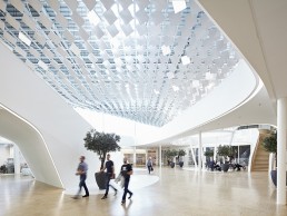 Covering the whole atrium ceiling the sculpture demonstrates the behaviour of light, both natural and artificial: reflection, diffusion and emission.