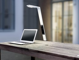 Available in orange, black, white and aluminium finishes, FLEX can operate as a table or wall lamp. Its angled design supports itself against a wall or the side of a table by using a height-adjustable rubberised protective sleeve. FLEX’s integrated lithium-ion battery is capable of powering the lamp for up to ten hours, delivering portable human centric lighting. The biologically effective light is able to replicate daylight, with its cold white and warm white LEDS that produce an illuminance of up to 1,000 lux, and between 2,700K and 6,500K. FLEX’s lamp head can be rotated 180° to provide direct or indirect lighting. With a height of 136cm, the cordless workplace lamp weighs just 2kg, allowing for easy relocation.