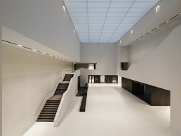 In order not to encumber the ceiling surface’s visual effect, the foyer illumination has been fully integrated into hidden wall recesses throughout. For the adjacent courtyard, ERCO downlights have been integrated into the vertical façade surfaces, illuminating the patio and orchestrating the sculptures and objects on display. The light sources remain concealed as visitors pass the staircase connecting the foyer and exhibition spaces on the second and third floor. Nevertheless, the sculptural character of the staircase is emphasised by light emanating from the linear ceiling recess – appearing as a dark groove from below.