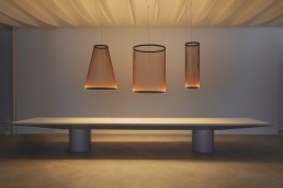 Composed of an array of fine threads pulled taut between two aluminium rings, the collection presents a variety of elegant conical and cylindrical silhouettes that shimmer enticingly overhead, evoking a sense of refinement that can be enjoyed in any context.