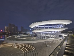 Situated on an artificial island with an area of about 20,000sqm, radiant in-grade lines of light correspond with the paving pattern that originates at the centre of the helix’s geometry. Zooming in, concealed step lights and under bench lighting details accentuate the stage and steps, while miniature in-grade LED uplights at the base of each vertical structural beam illuminate the edge of the vertical elements. This serves to generate a subtle visual framework for the spiralling ribbon, complementing the fluidity of the design and contrasting it against the nighttime backdrop of the city.