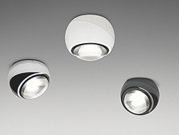 Thanks to the virtually invisible separation of the two sphere halves, the io giro surface-mounted spotlight can be freely rotated and pivoted by up to 45° from vertical without changing its form. In doing so, characteristic Occhio lenses offer various lighting effects in high quality. Recessed spotlight io piano takes the design and lighting effects of io and integrates them in the ceiling, thus completing the range of applications. A movable and a fixed version as a pure downlight are available. Round, square or seamless recessed options may be selected.