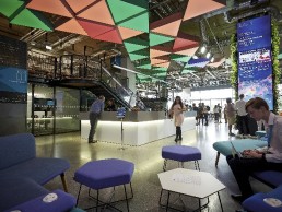 Inspired by the principles of urban planning, architects Grimshaw developed a design that emulates a cityscape, with mixed-use spaces that lead from a central high street, including public and private spaces, streets, squares and civic areas. Spaces are designed to intersect and weave together, contributing to a sense of community, while each zone has its own distinct identity within the various quarters. The building also comes complete with events spaces, an indoor park and an interactive living wall.