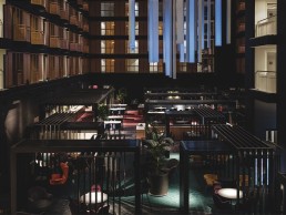 The renovation centred around the heart of the hotel – a vast interior atrium overlooked by guest rooms and surrounded by perimeter skylights. The atrium features a bar and café, alongside multi-purpose areas and pre-function spaces.