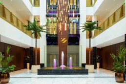 A dynamic staircase leads to the upper levels, where weddings take centre stage. Suspended above is a bespoke chandelier of glass petals, again by Chantelle Lighting, a floral interpretation of modern grandeur. The Royal Suite, the largest of the event spaces, orients around a stage for the bride and groom, and can host hundreds of guests. Its walls are lined with illuminated fabric panels that can shift in colour or display graphics, allowing the space to flex between traditional ceremonies and contemporary corporate functions. Smaller suites on higher floors echo this adaptability, positioning the Pyramid as a multi-purpose venue for weddings, banquets and business events alike.