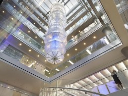 “The lighting design creates an enigmatic display,” said Konstantinos Mavromichalis (lighting designer). “Natural daylight, from the atrium skylights above, blend with the light emitted from the cocoon’s spine. This allows for rich interactions of varying forms of light and, through the translucency of the material, results in a striking visual display that has been informed by the feelings of the building’s occupants.”