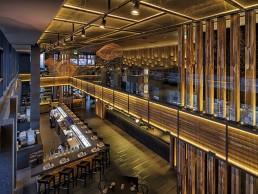 Well lit, open kitchens and cooking counters have been designed as a stage for chefs to perform the art of Japanese cooking. Every feature and display has been selected with care and features well integrated lighting technique which focuses on presenation rather than detail.