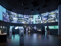 Exhibitions throughout are housed in a labyrinthian series of stacked box pavilions, each organised around a unique spy-related theme. The spatial arrangement was designed to play with perceptions, with partially concealed interstitial circulation spaces opening up into immersive, fully interactive multimedia environments.