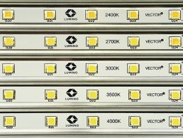 Vector is one of Lumino’s new High CRI products, reaching up to Ra95 and up to Ra98 for the CRI Pro range. With high Ri values across the whole R1-R14 colour palette, colour is rendered to a high standard. The new proprietary phosphor-core from Lumino converts single frequency 450nm blue light into full spectrum, visible white light with strong rendering of reds, blues, greens, oranges and yellows. High CRI is available in an all new CCT palette starting at Candlelight Warm White 2,000K with 2,400K, 2,700K, 3,000K, 3,500K, 4,000K and 4,500K.