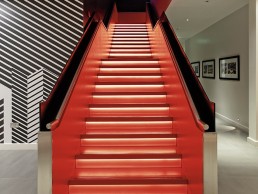 To give it prominence, the reception desk features leather clad front panels, with an integrated line of light, created by Optelma’s Firo, picking out the texture of the material. XAL’s Tula Micro narrow, cylindrical feature pendants are suspended above the desk. These provide illumination to the worktop, adding interest and breaking up the space. A feature staircase leads from the reception to the lower-ground floor, with integrated lighting adding a sense of theatre.
