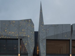 These luminous cavities perforate through the precast concrete paneling in an organic pattern, in contrast to the facetted, monolithic structure.